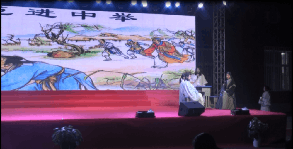 高三年级李秋芸、魏思琪、冷依萌、李秋芸、黄逸轩、肖愉用全新的方式演绎话剧《范进中举》。