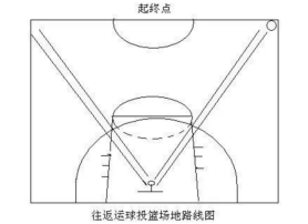 (测试三次以成绩最优一次记录成绩)由球场右侧边线中点开始,面向球篮用右手运球上篮,同时开始计时;球投中篮后,仍用右手运至左侧边线中点;然后折转换左手运球上篮;投中篮后,还用左手运球回到原起点,同样重复上述运球投篮一次,再回到原起点时停表。连续运球,不得远推运球上篮;必须投中篮后,才能继续运球,投不中要继续再投,直到投中,投篮的手(左手或右手投)不加限制。
