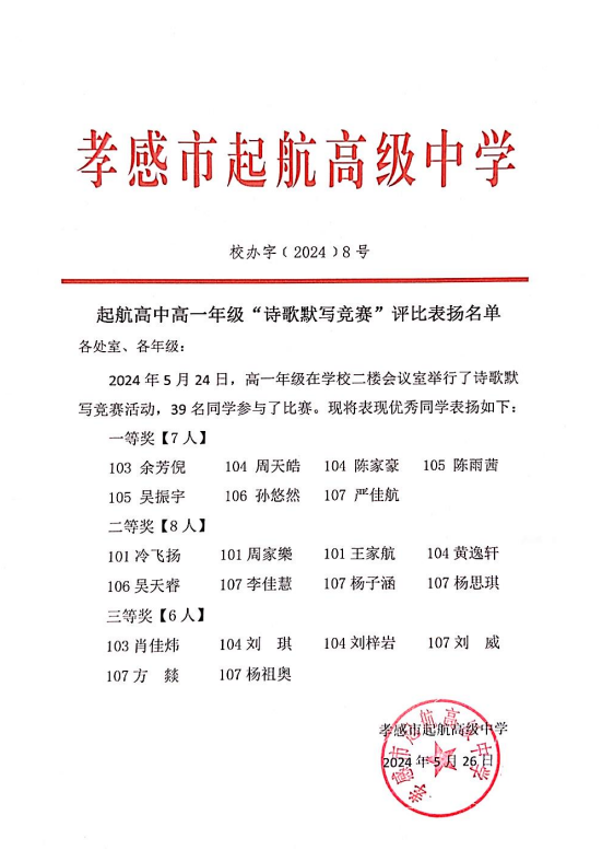 2024年4月26日关于颁发高二年级古诗文默写比赛表彰的决定